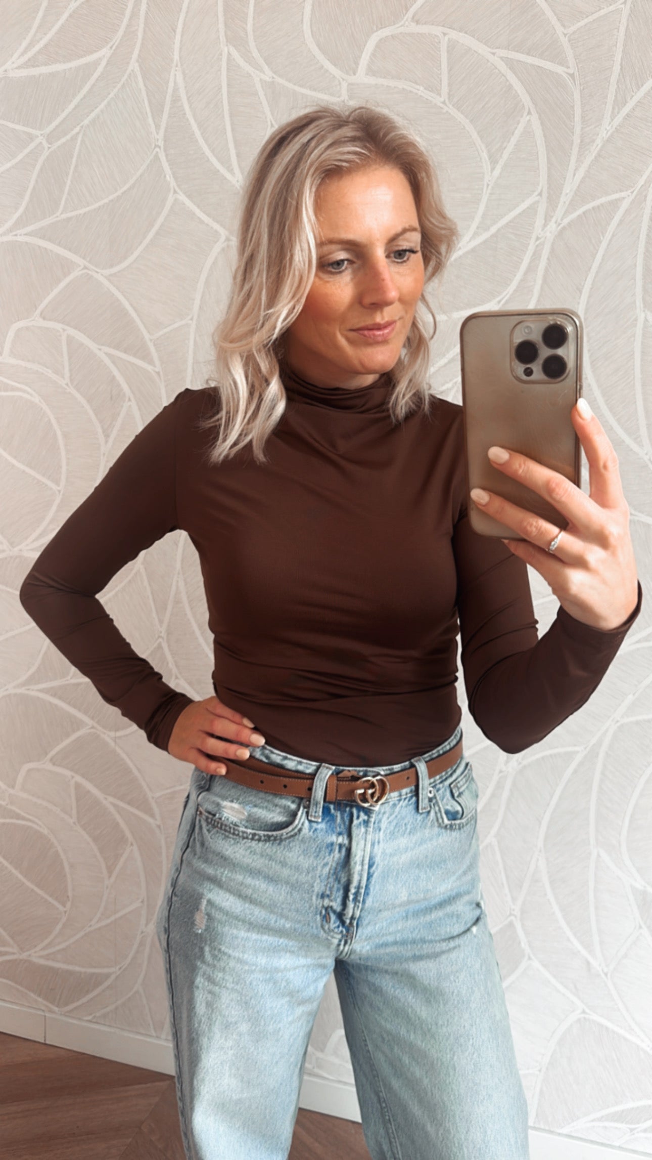 De aangesloten pasvorm zorgt voor een gestroomlijnd silhouet — ideaal om te dragen onder een blazer, trui of simpelweg met je favoriete jeans. De diepe bruine kleur voegt warmte toe aan je look en is eindeloos te combineren.