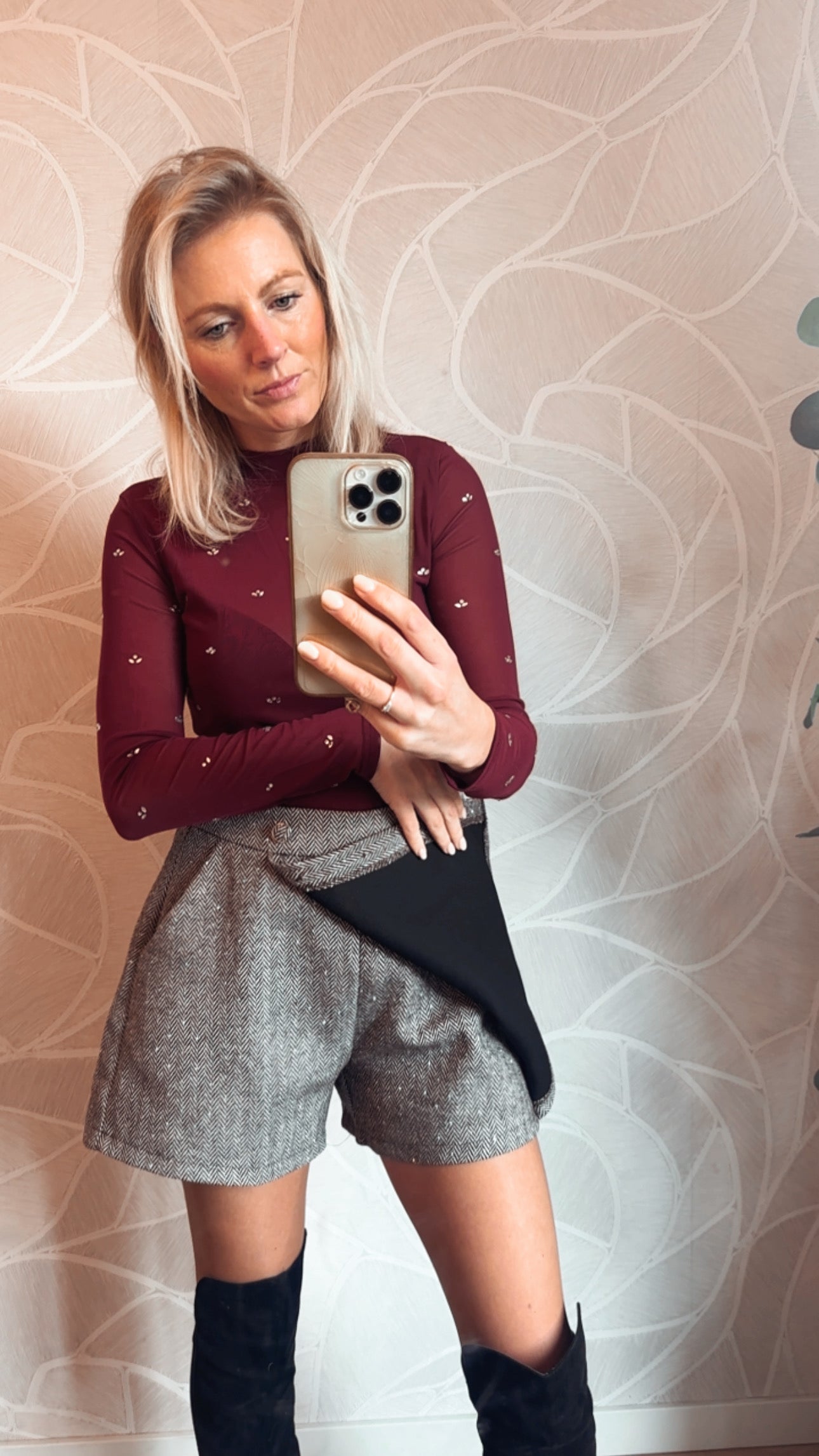 Geef jouw outfit een stijlvolle upgrade met deze skort: de perfecte combinatie van een elegante rok en het gemak van een short. Deze skort heeft een verfijnd visgraatmotief in zachte grijstinten met mini diamantjes, waardoor hij een luxueuze uitstraling krijgt die moeiteloos te combineren is met elke top — van een simpele basic tot een feestelijke mesh top.