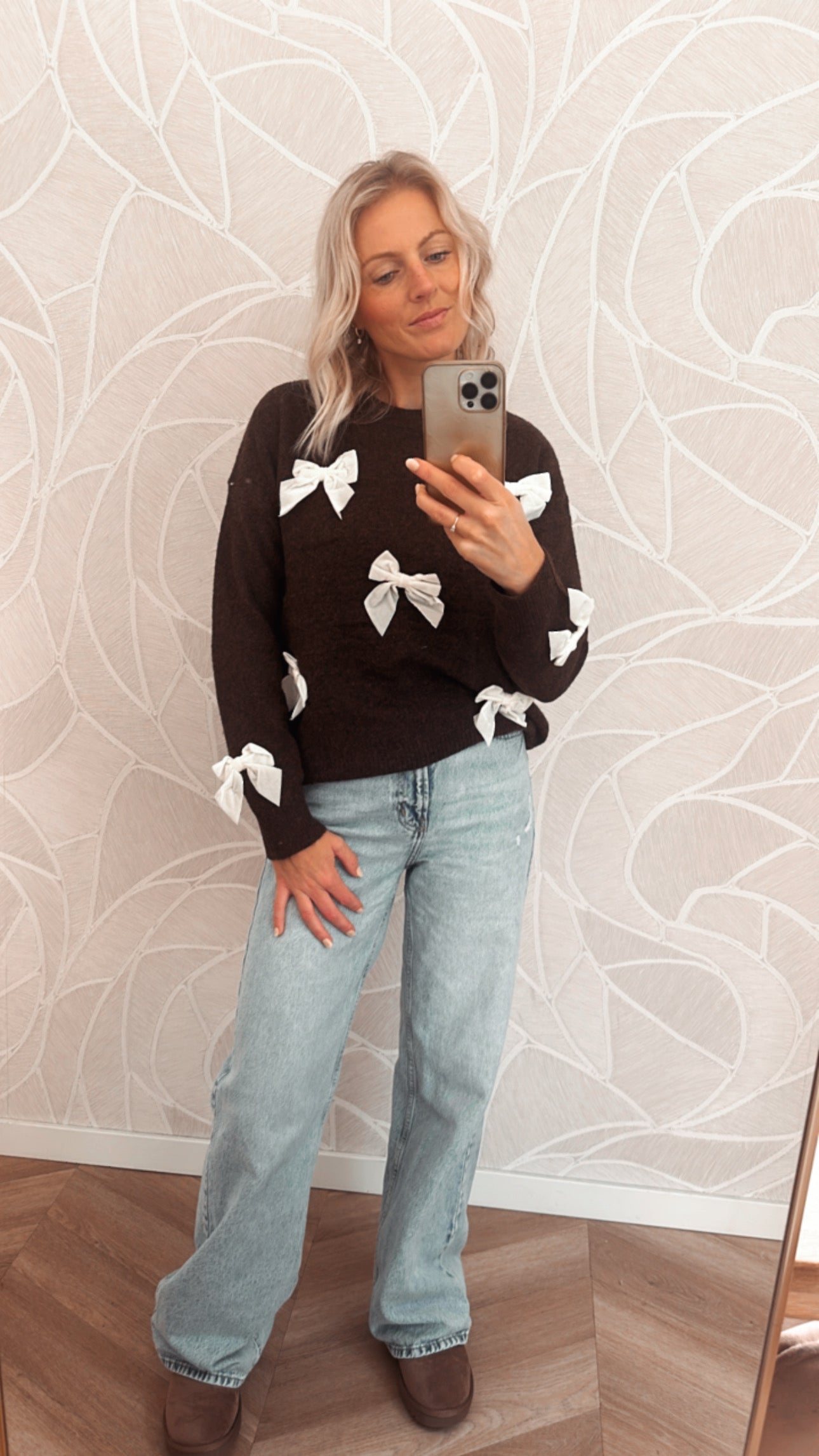 De Faye Bow Sweater is een vrouwelijke en speelse trui in een warme beige tint, versierd met chocoladebruine fluwelen strikjes.