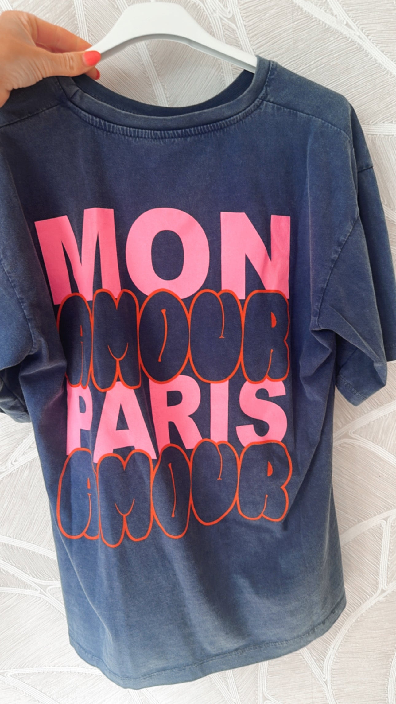 Trendy T-shirt met een stoere vintage wassing en speelse print. Op de voorkant staat subtiel de tekst “Mon Amour Paris”, terwijl de achterkant een opvallende statement print heeft. Het shirt heeft een relaxte, oversized fit waardoor het heerlijk comfortabel draagt.