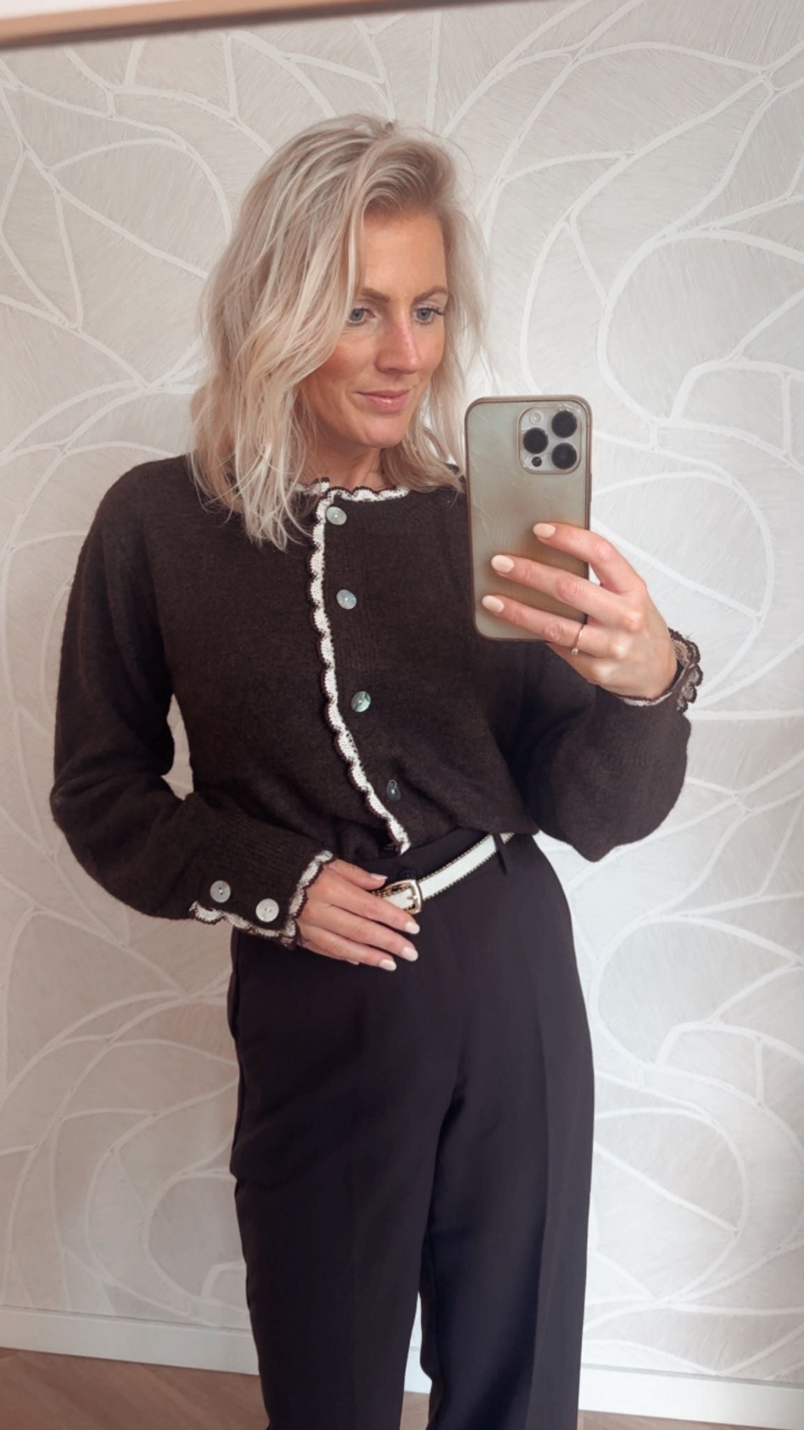 Dit elegante vestje is een subtiele eyecatcher door de golvende bies langs de knopenlijst en mouwen. De knoopjes geven hem een klassieke uitstraling, terwijl de zachte stof zorgt voor ultiem draagcomfort.