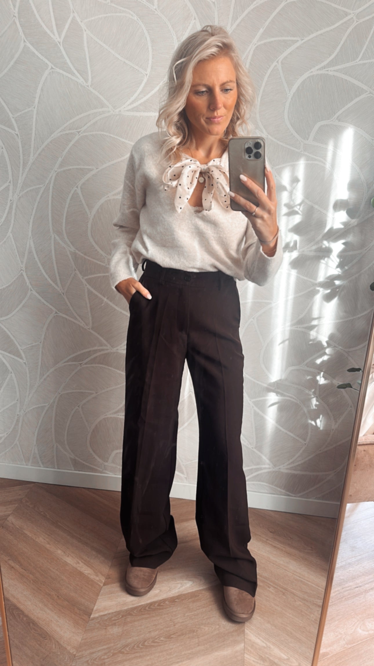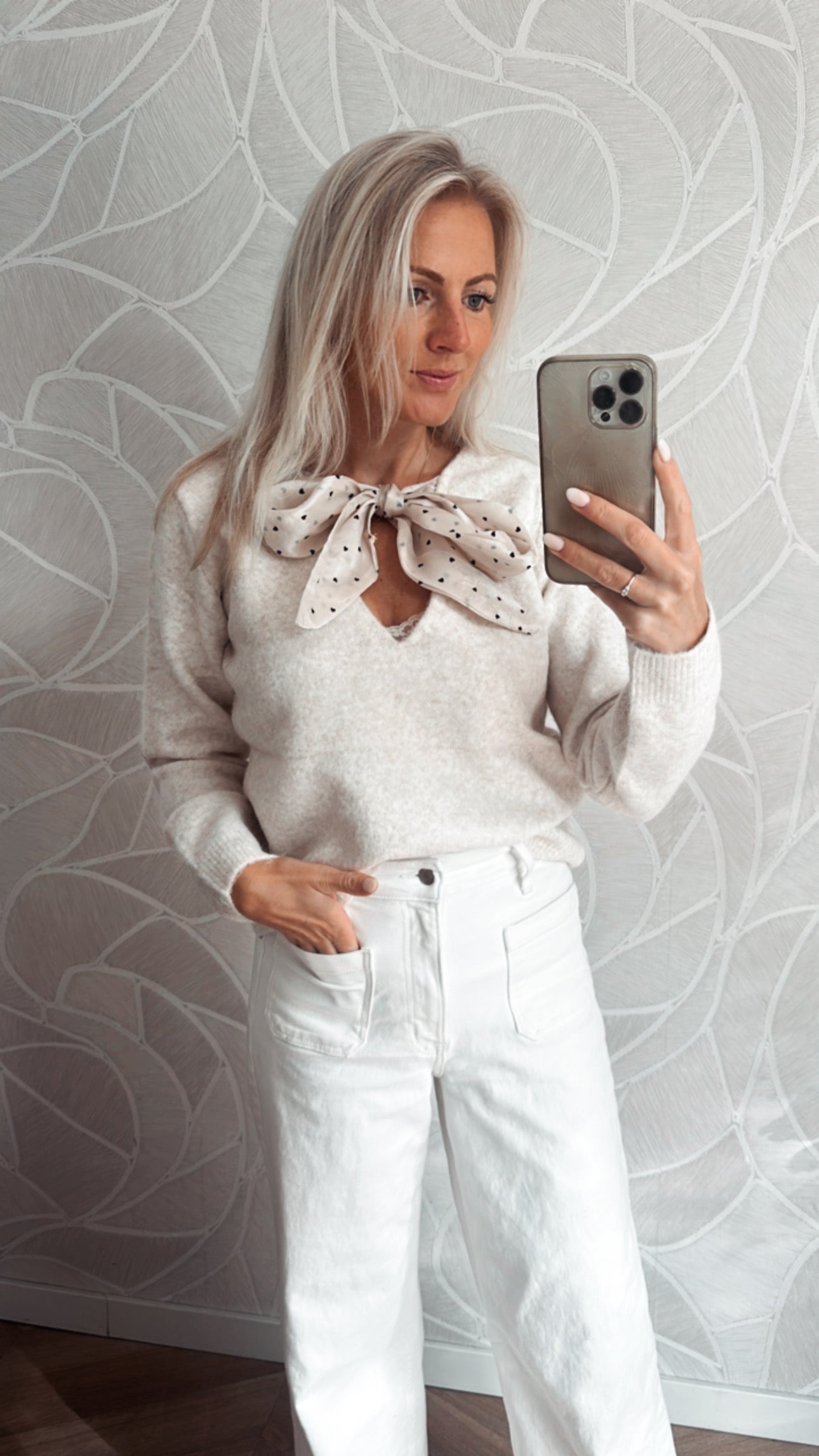 Deze romantische sweater is een echte eyecatcher door de vaste strik met speelse hartjesprint. De zachte stof en de relaxte pasvorm maken hem heerlijk om te dragen, terwijl de strik een elegante en vrouwelijke touch geeft. Combineer hem casual met een jeans of draag hem wat gekleder met een pantalon – perfect voor zowel werk als een dagje uit.